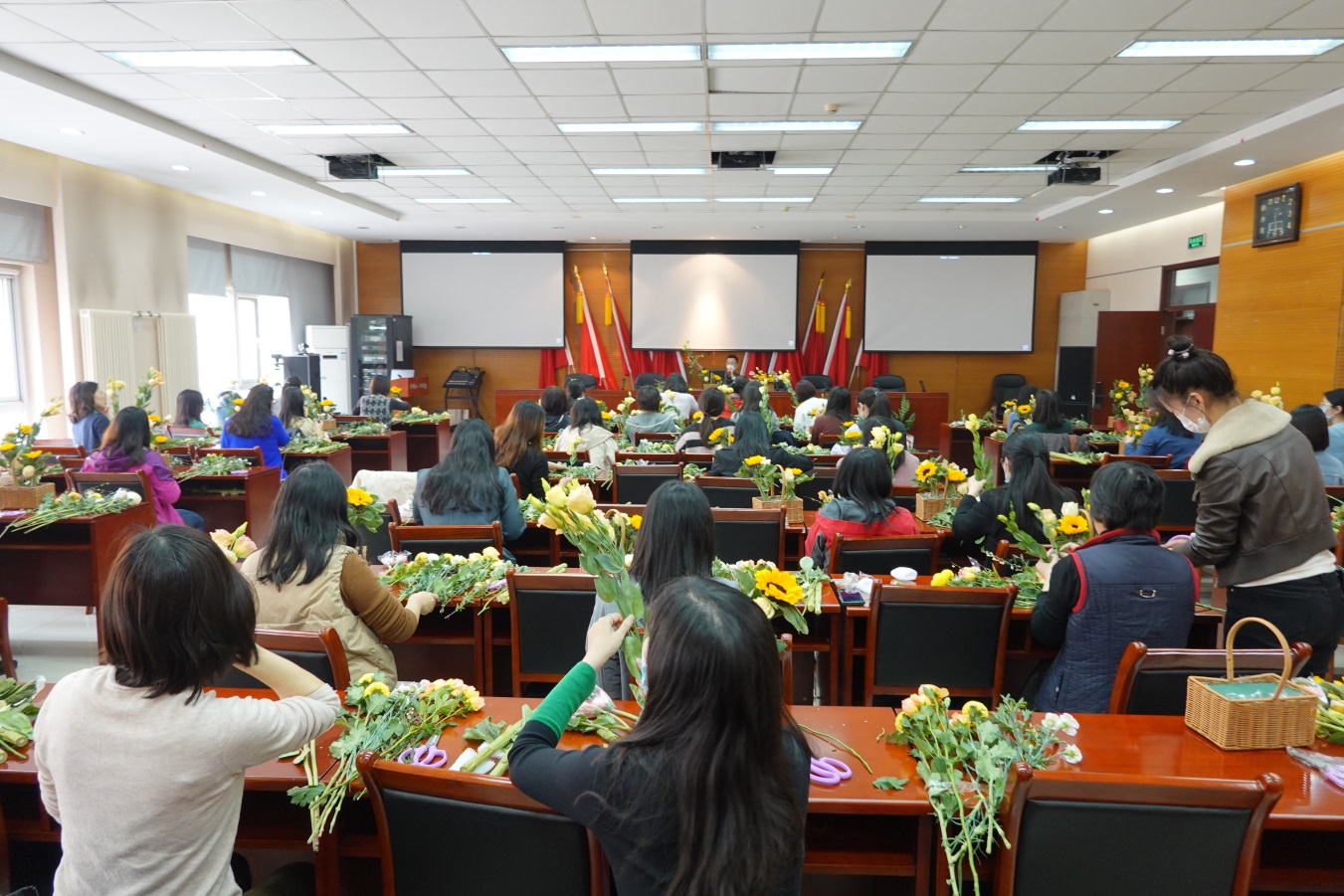 活动伊始,花艺师讲述了插花的基本要点并进行演示,使大家对插花这门艺术有了初步的认识。随后,女职工们结合各自手中的花材特点和审美情趣,从鲜花的取材、剪叶、构图、布局开始,不断地进行尝试和实践。在花艺师的指导和女同胞的相互交流中,一篮篮错落有致、生机盎然、创意十足的插花作品展现在众人眼前。欣赏着自己亲手创作的插花作品,每个人都感到满满的成就感与幸福感。