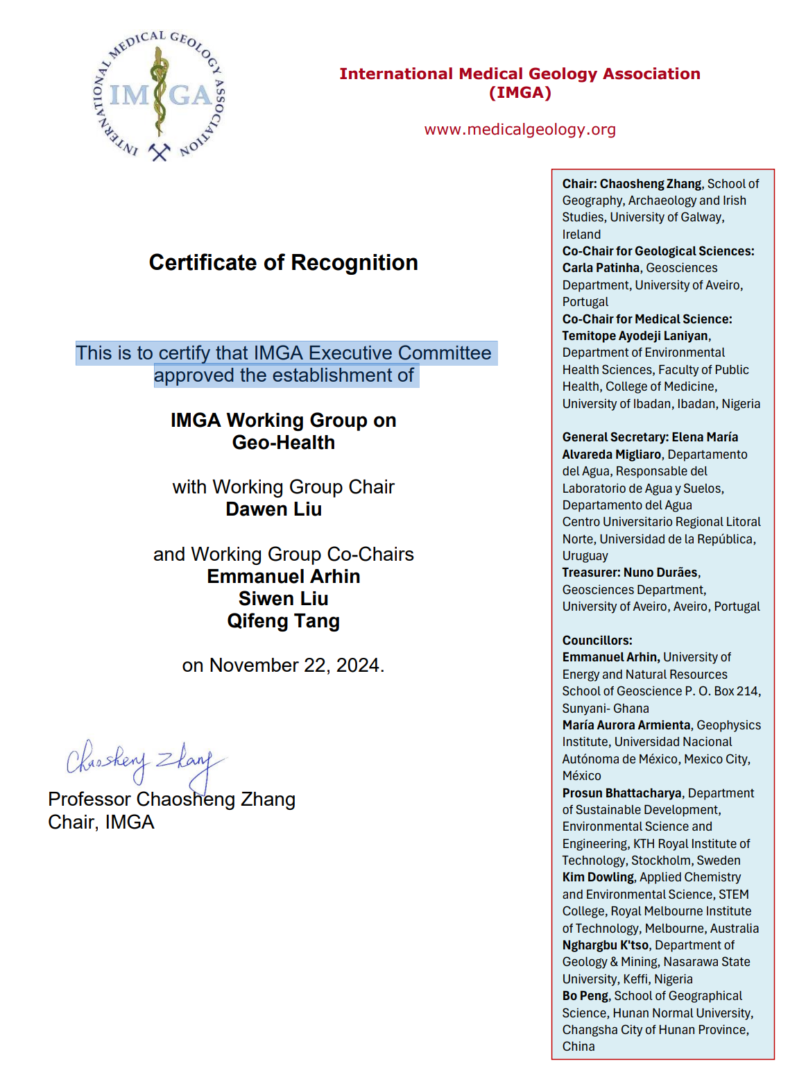 国际医学地质协会批准工作组的证书